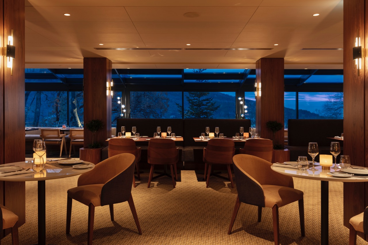 Floor-to-ceiling windows frame panoramic forest and lake views, while natural materials, warm textures, and soft lighting create a sense of understated luxury.